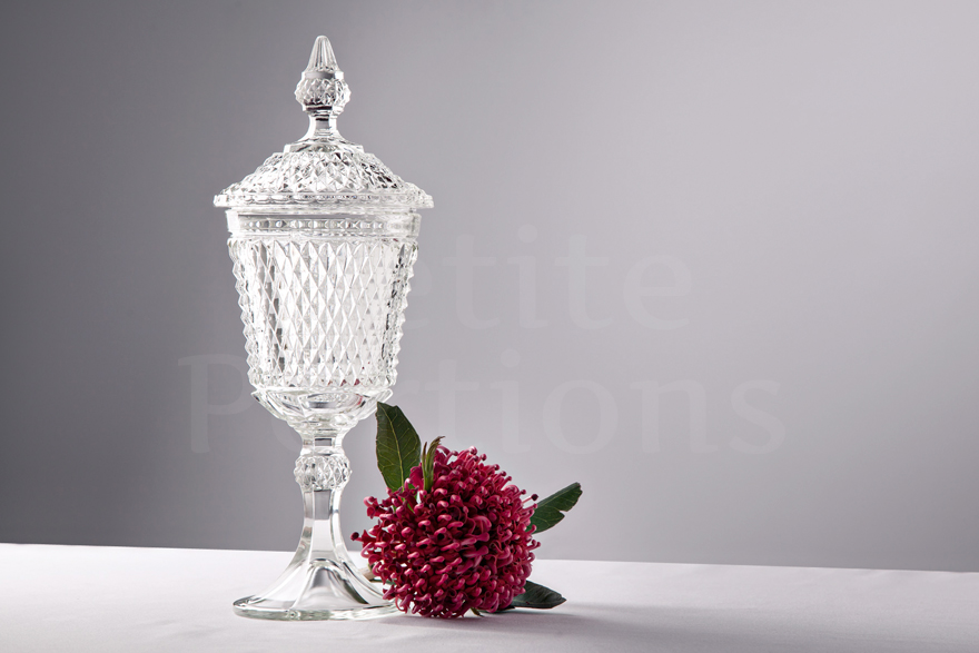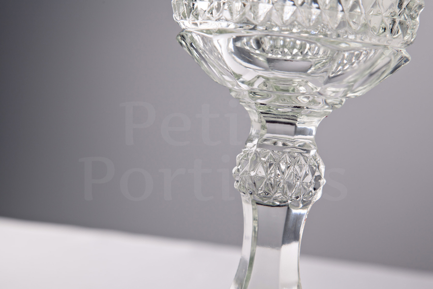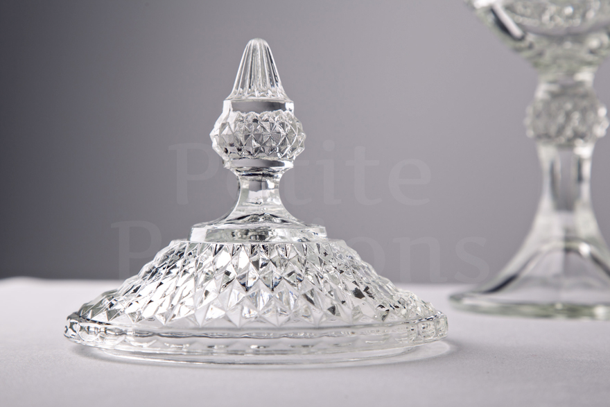 As another elegant member of the Diamond Point compote family, this stunning conical compote features a highly ornate lid with dramatic finial. Featuring a deep set diamond pattern across its cup, lid and a portion of its stem, its sizeable interior means it will hold a number of sweet treats with elegance and style.