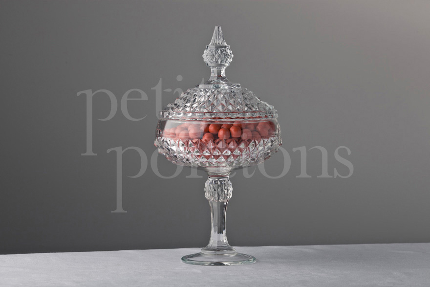The big sister of the Diamond Point Open Compote, this stunning pressed glass gem features a highly ornate lid with dramatic finial. Featuring a deep set diamond pattern across its cup, lid and a portion of its stem, its sizeable interior means it will hold a number of sweet treats with elegance and style.
