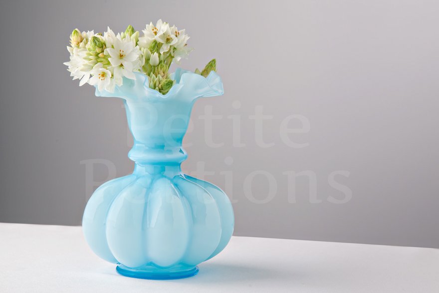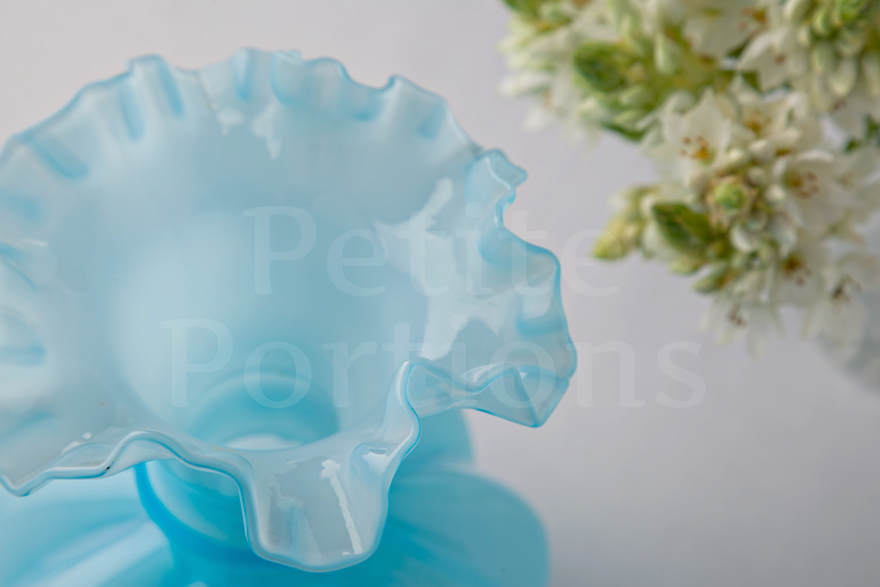 With its dreamy blue hue and generous size, this hard-to-find vintage vase is pure sweetness. Features a pale blue base which graduates to a milky blue hue at its centre and ruffled top. Perfect for when you want to inject some soft blue colour to your table.
